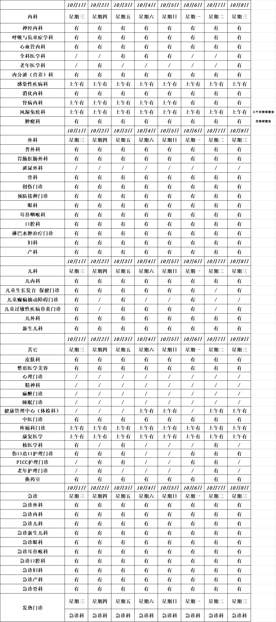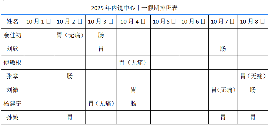 内镜中心:10月2日、3日、4日、7日、8日的上午开展胃肠镜检查项目,下午休息。10月1日、5日、6日全天休息。